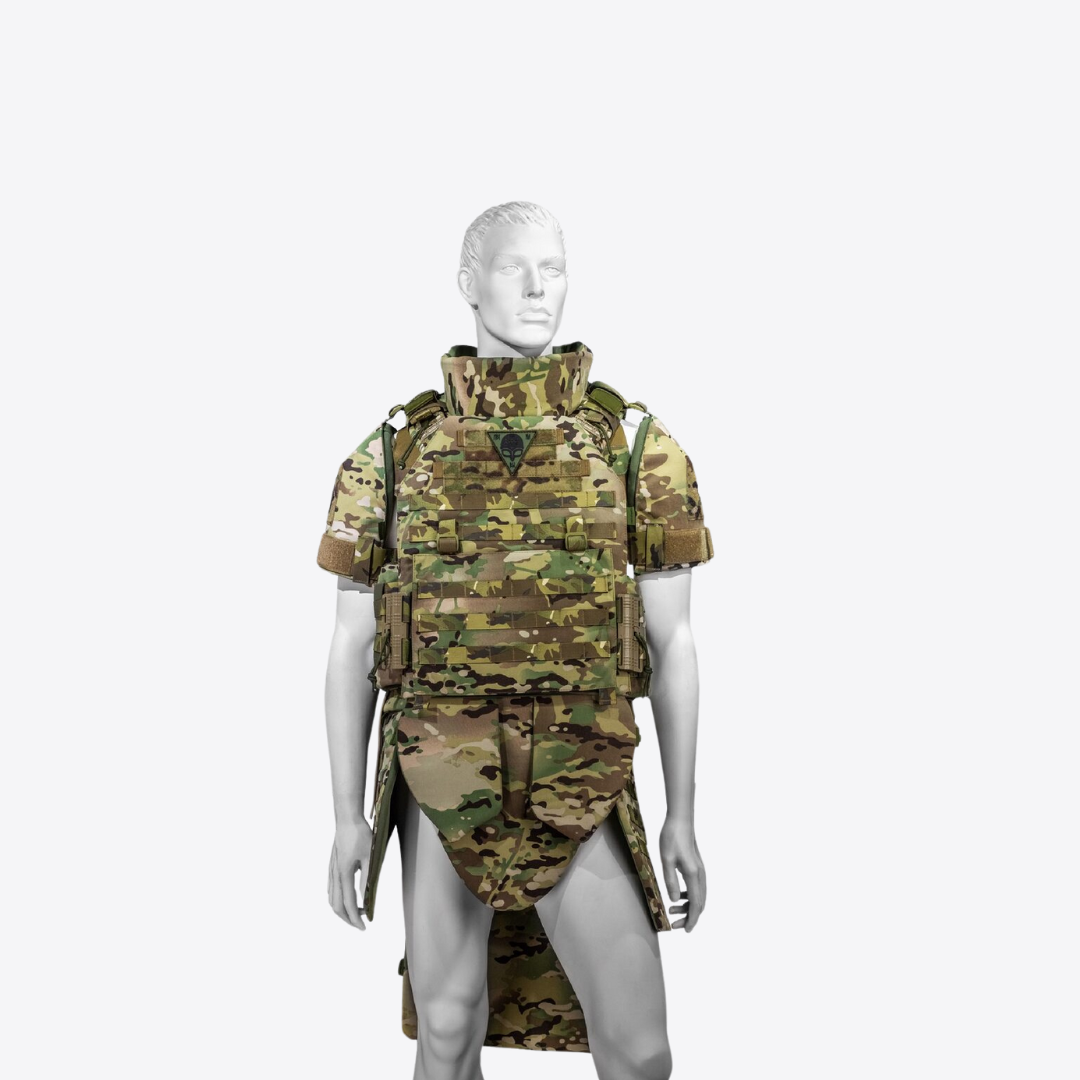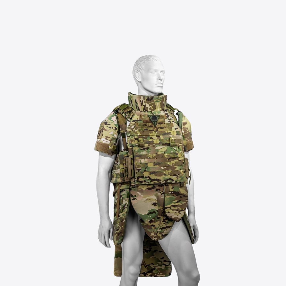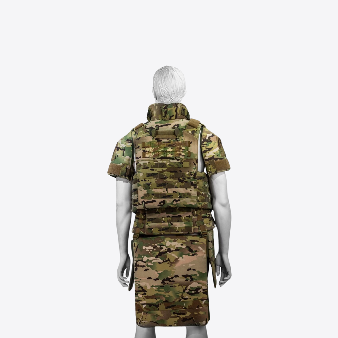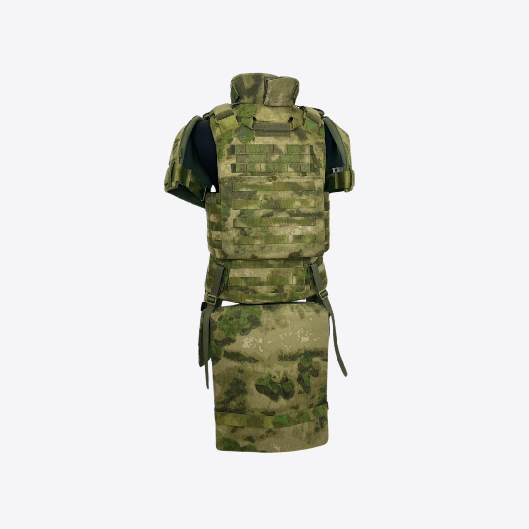 Комплекс защиты включает плитник, защиту затылка, плеч, шеи, паха, боевой тактический пояс