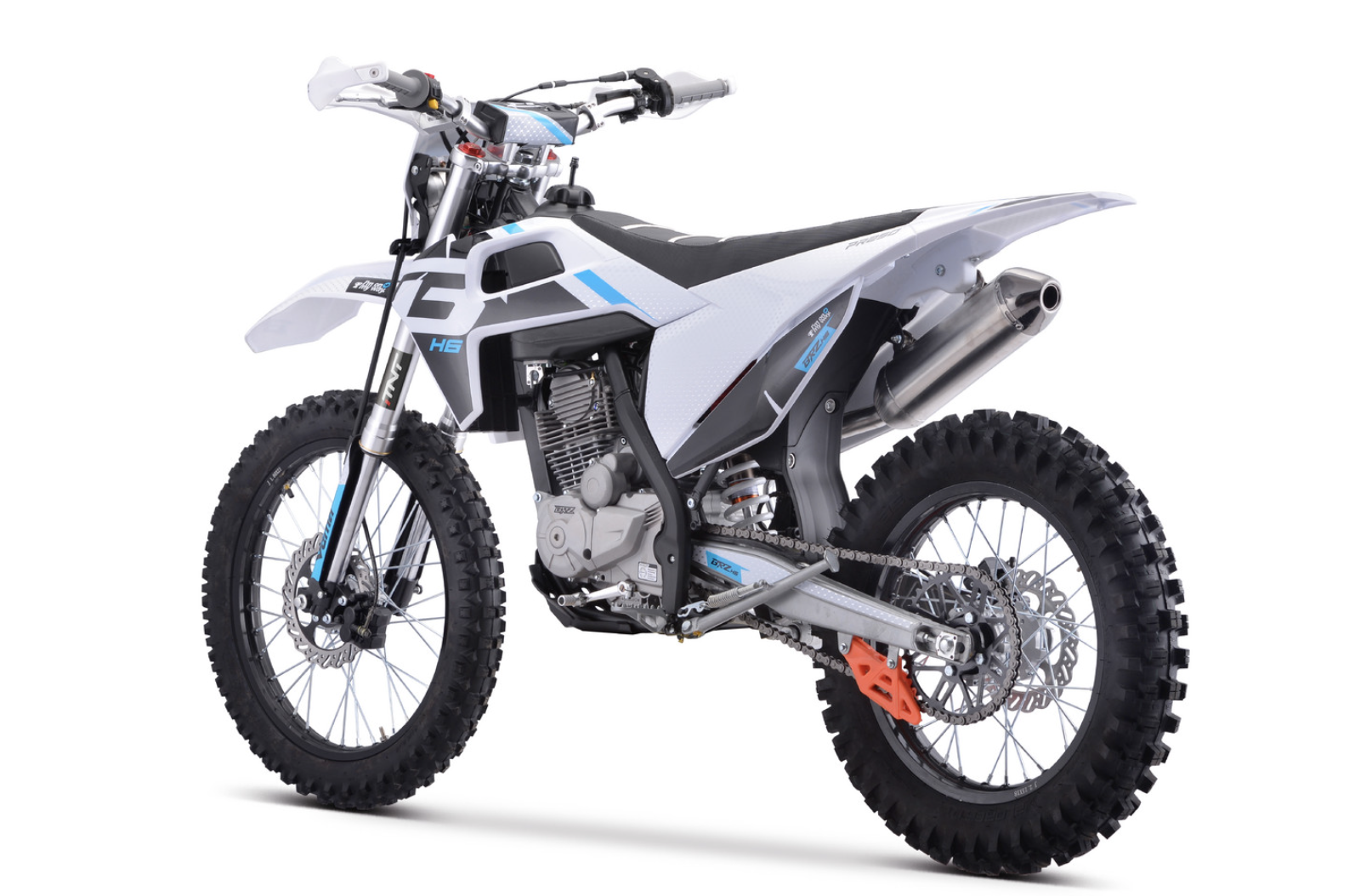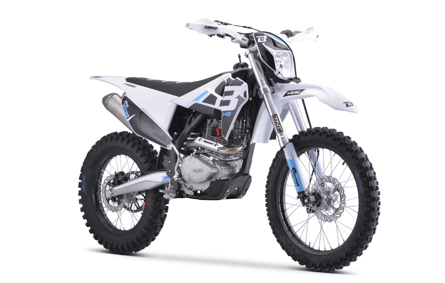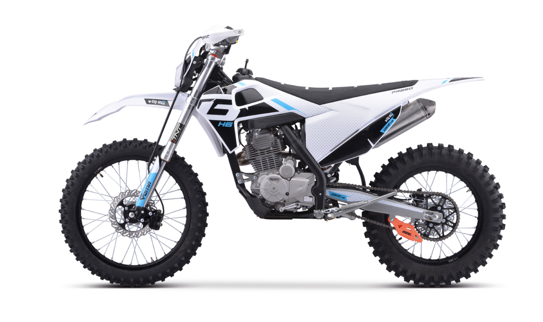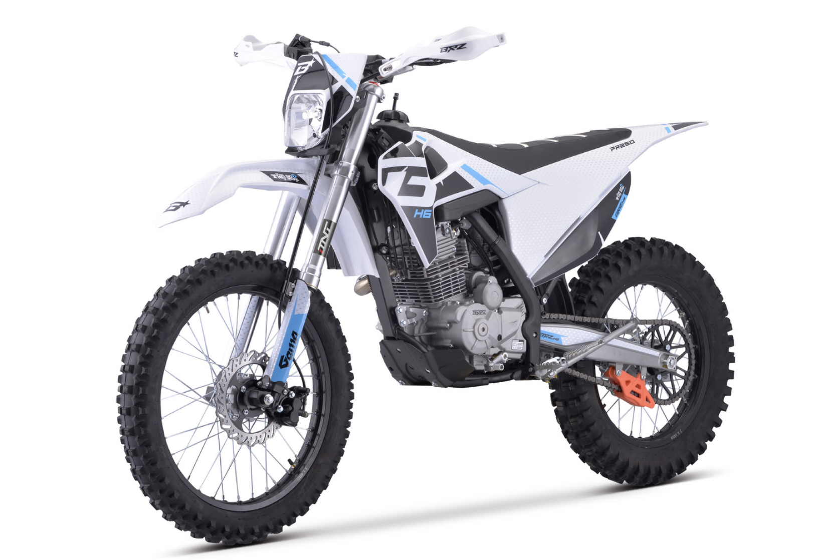BRZ H6 PR250 21/18 - ваш пропуск в мир приключений. Надежный двигатель ZONGSHEN ZS172FMM-5A с баланс.валом в паре с карбюратором Nibbi Racing PE30 выдает превосходные мощность и тягу. Короткоходная ручка газа обеспечивает мгновенную реакцию. Воздушное охлаждение обеспечивает надежность и простоту эксплуатации, а пластик в стиле Husqvarna подчеркивает его стильный вид. BRZ H6 PR250 21/18 - это ваш верный спутник в мире эндуро. Он обладает всем необходимым, чтобы вы могли покорять бездорожье с уверенностью: Счетчик моточасов для контроля состояния двигателя, защита рычагов. Мягкая резина Gema для уверенного сцепления с любой поверхностью. Небесно-голубой цвет придает мотоциклу легкость и свежесть. С BRZ H6 PR250 21/18 вы ощутите свободу и драйв!