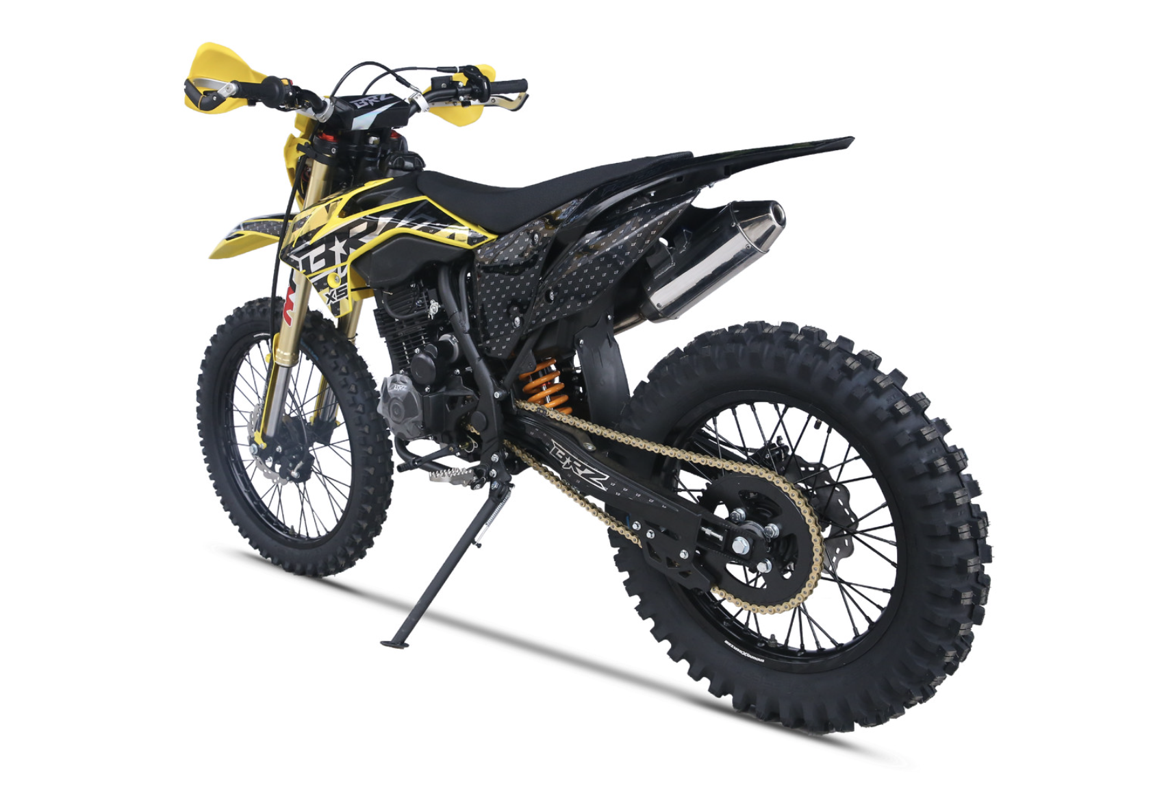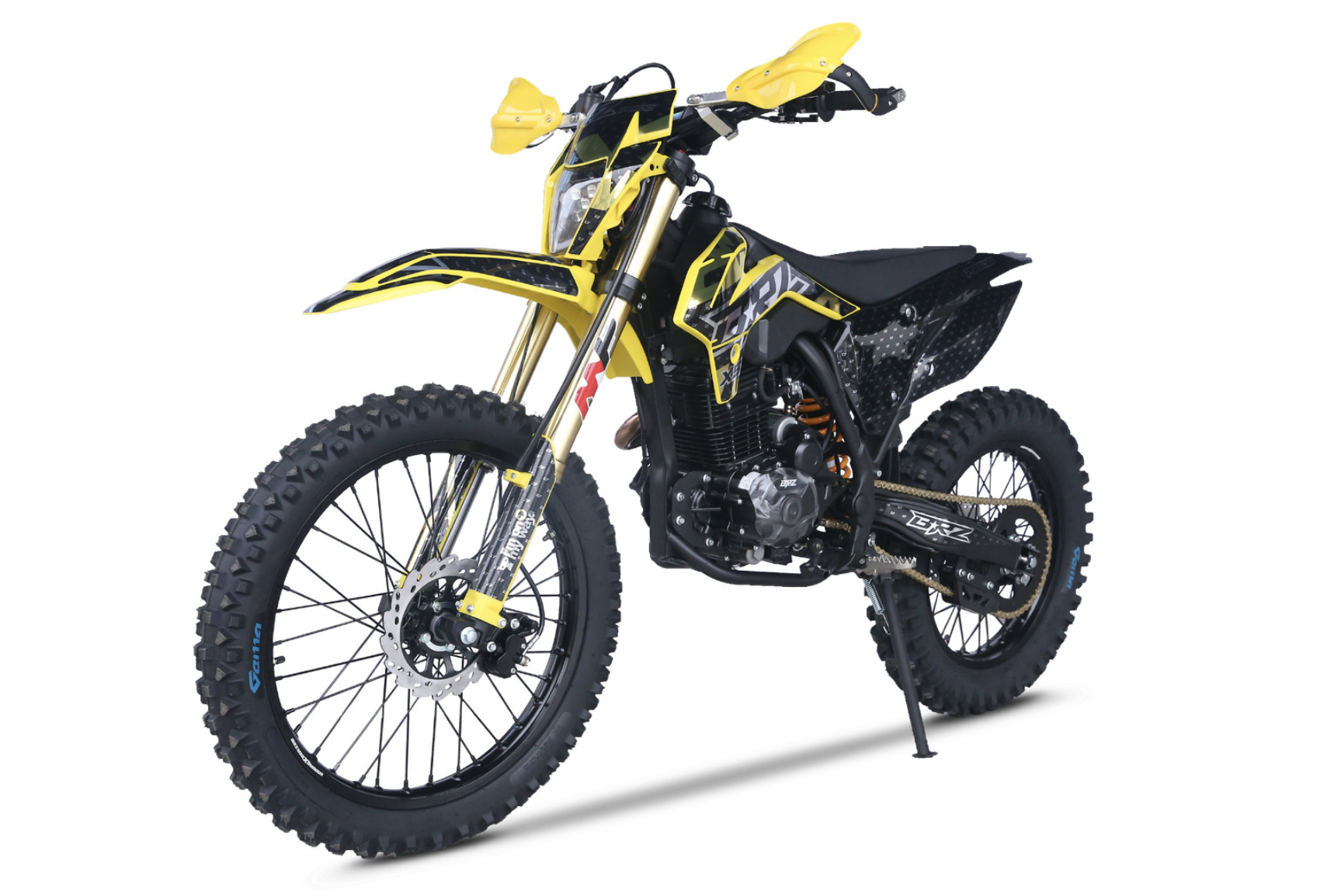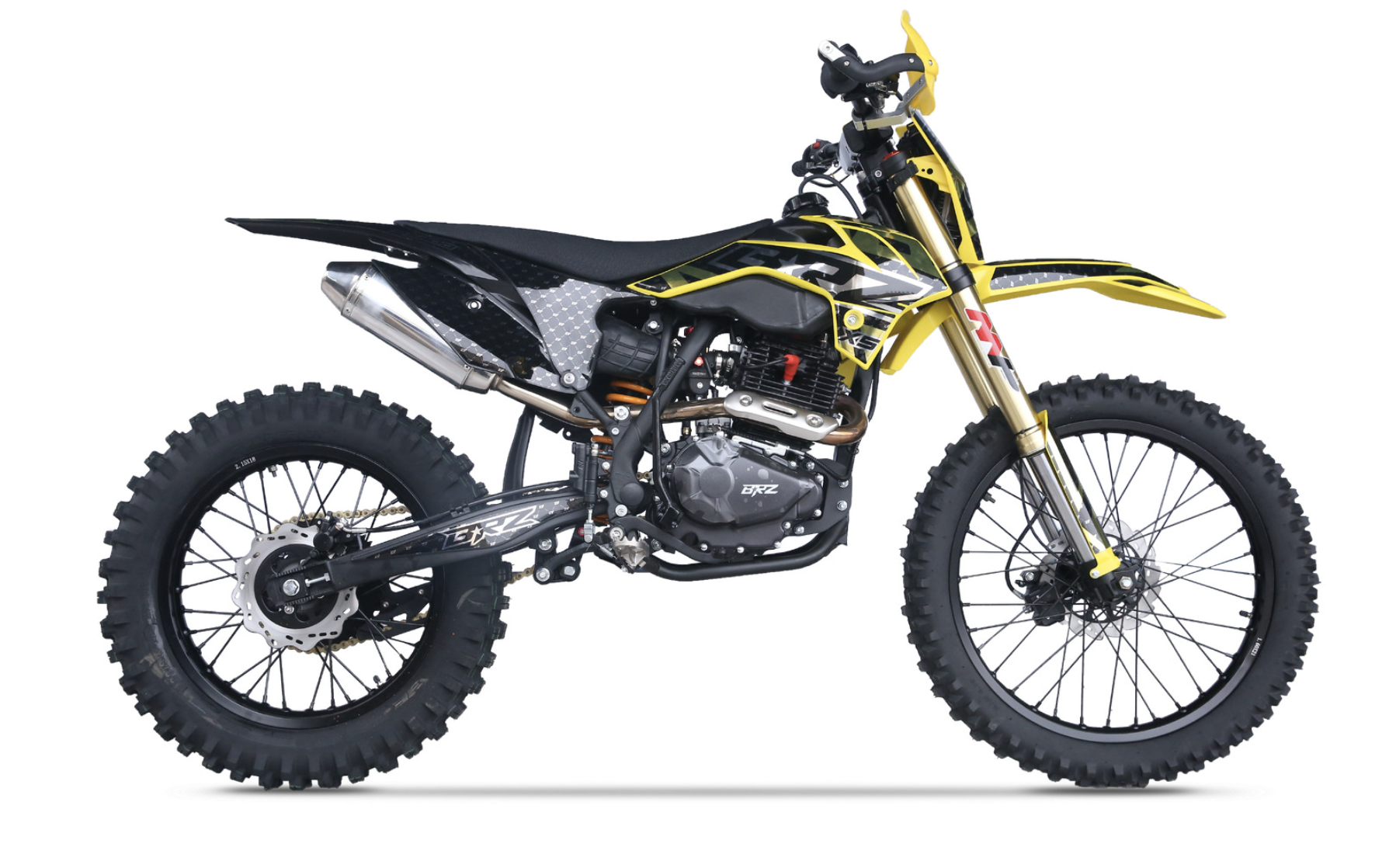 Мотоцикл BRZ X5 PR300 YELLOW - живая легенда, хит продаж. Это среднеразмерный мотоцикл с мотором Zongshen ZS172FMM-5 с баланс. валом и кубатурой 300 см3. Двигатель работает в паре с карбюратором NIBBI Racing Black PE30, который отлично раскрывает его потенциал. BRZ X5 PR300 YELLOW получил регулируемую вилку MNT, зеркало 41 мм. Задний амортизатор также имеет необходимые регулировки. С завода BRZ X5 PR300 YELLOW оснащен отличной резиной Gema, спереди F-Enduro 90/90 - 21, сзади "жирнющая" мягкая XPlorer 754 01 120/80-18. Мощный зацеп уже с коробки! Для комфорта и удобства райдера предусмотрены все необходимые опции - отличная защита рычагов, рычаги "неломайки", приборная панель. Если вы давно искали надежный, легкий, хорошо укомплектованный эндуро с мощным мотором, то мотоцикл BRZ X5 PR300 YELLOW это отличный выбор, особенно для новичка.