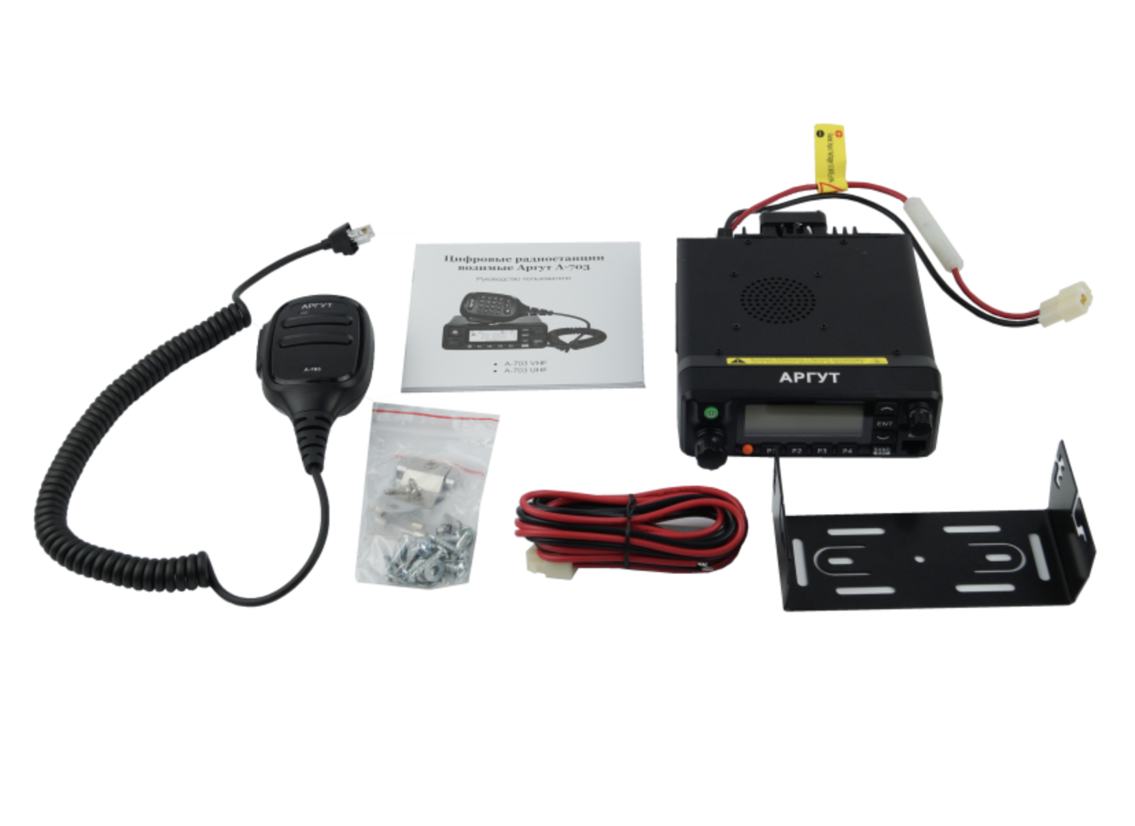 Радиостанция может быть установлена в транспортном средстве в любом удобном месте, для этого в комплекте имеется металлический кронштейн и набор винтов.
